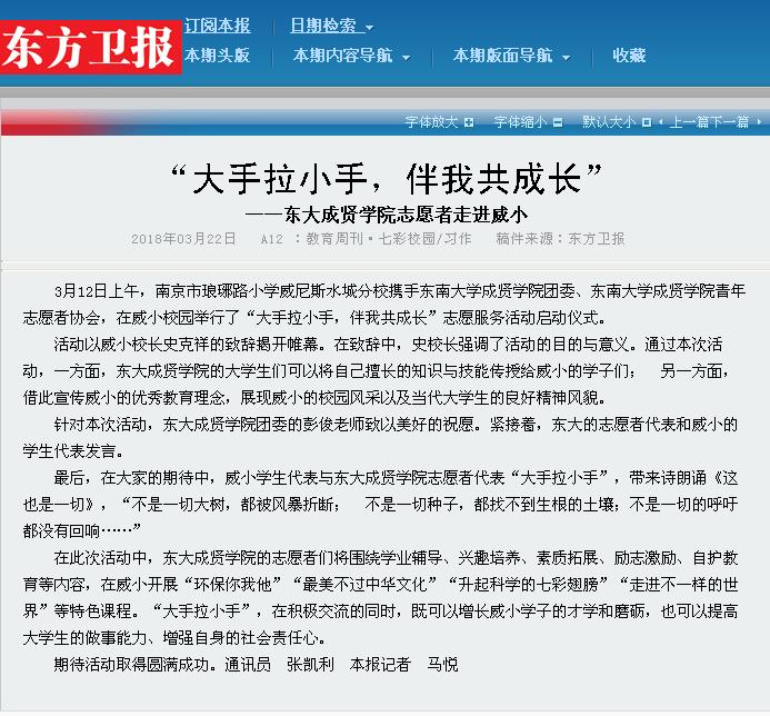 【东方卫报】“大手拉小手,伴我共成长”——东大Beat365亚洲版官网志愿者走进威小