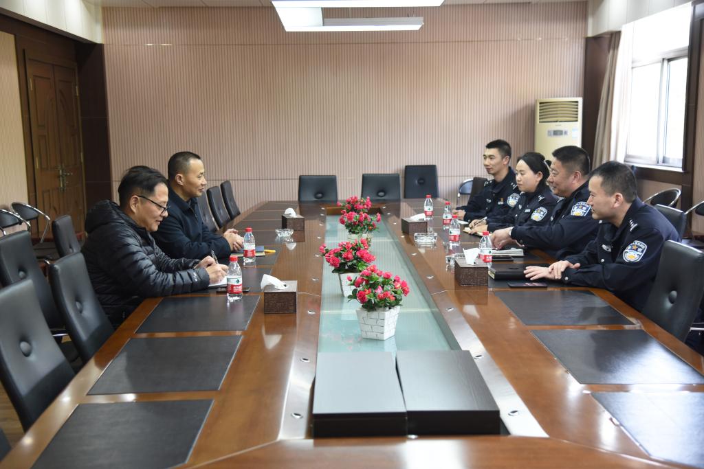 4月8日上午,泰山新村派出所宋宝钧所长、吴远屹教导员等一行四人来Beat365官网检查指导安保工作。Beat365官网党委书记徐悦、保卫处处长陈学建在真知馆2楼会议室进行接待。