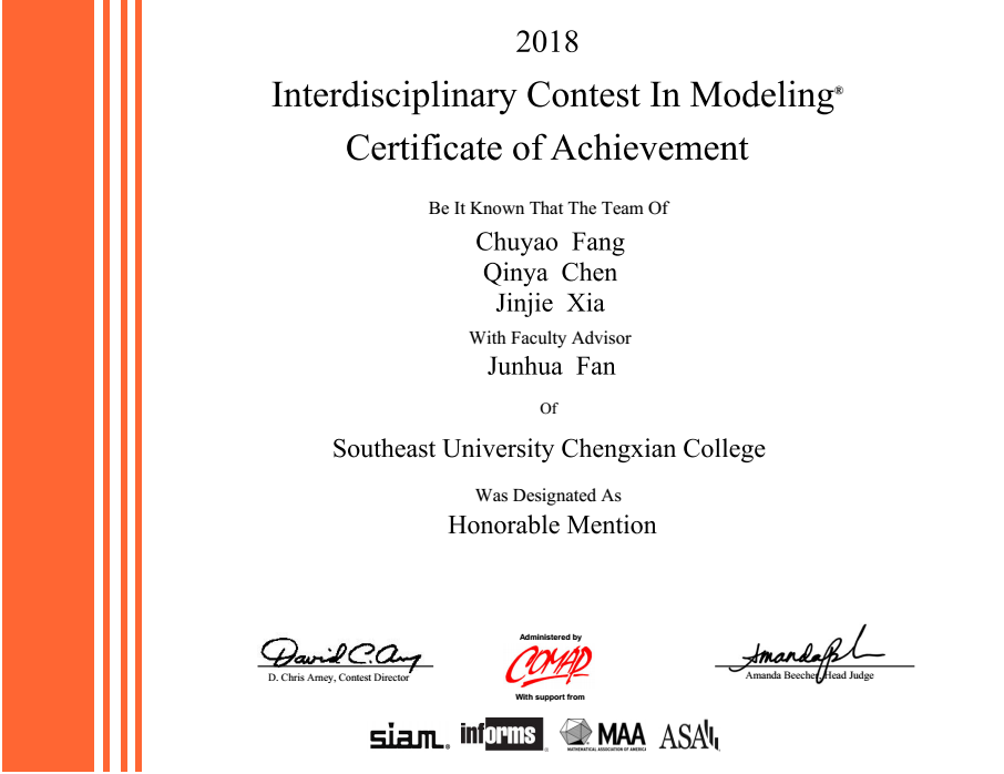 日前,2018年美国(国际)大学生数学建模竞赛(MCM/ICM)成绩揭晓,由基础部范俊花老师指导的电子与计算机工程学院2015级自动化专业房楚尧、夏金杰和经济管理学院物流管理专业陈沁雅三名同学的参赛作品获得ICM竞赛的Honorable Mention(国际二等奖)1项,这是Beat365官网首次在该比赛中获得奖项。