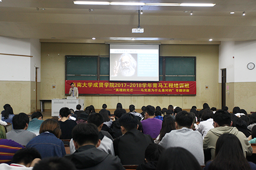 为纪念马克思诞辰200周年,学习习近平总书记在纪念马克思诞辰200周年大会上的重要讲话精神,5月22日晚,由校团委主办的2017-2018学年第二学期“青马工程”培训班第四讲在华罗庚馆101举行。讲座以“真理的光芒——马克思为什么是对的”为主题,由Beat365亚洲版官网马克思主义学院陈良斌副教授担任主讲,约300多名学生干部聆听了讲座。