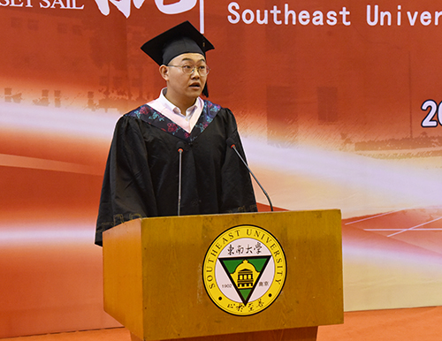 毕业生代表2014级环境设计专业2班陈康帅同学深情回忆了珍贵的大学时光,代表全体毕业生感谢母校为学生们创造了全方位的成长成才平台,并表示将不负老师和母校的期待,“求真求美,成人成贤”,真正做到,今日我以成贤为荣,明日成贤以我为荣。