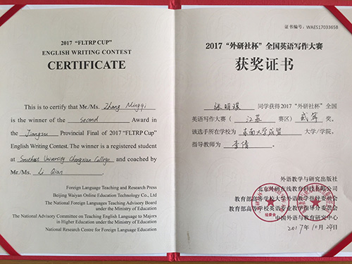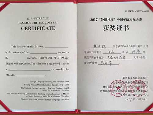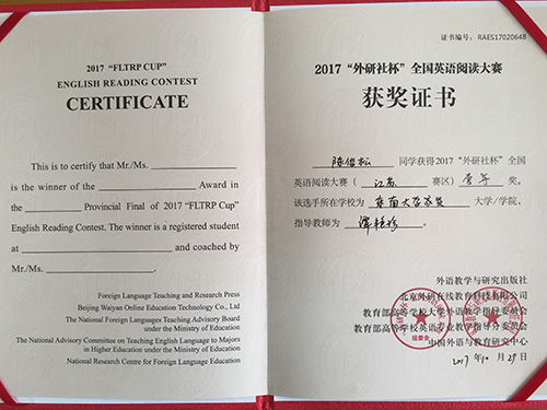2017年 “外研社杯”全国大学生英语挑战赛江苏赛区比赛于11月4日在常州大学圆满落下帷幕。该挑战赛分为英语写作大赛、英语阅读大赛和英语演讲大赛三部分。Beat365官网2014级建筑工程2班陈俊松(指导老师:谭艳珍)在英语阅读大赛中获一等奖,这是目前Beat365官网在省级英语阅读比赛中获得的最好成绩。此外,2017级工商管理类2班张明琪(指导老师:李倩)获江苏赛区英语写作大赛二等奖;2017级工商管理类5班龚洁茹(指导老师:朱宇博)、2015级电子商务2班桑明珠(指导老师:燕如萍)获江苏赛区英语写作大赛三等奖。