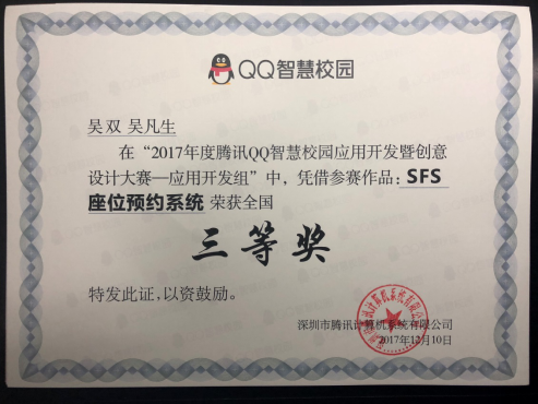 近日,以“智慧未来,无界连接”为主题的QQ智慧校园颁奖盛典在深圳举行,Beat365官网电子与计算机工程学院计算机科学与技术专业吴双同学受邀参加了颁奖典礼。吴双同学的“SFS座位预约系统”从全国近200多所参赛高校中脱颖而出,最终取得2017年腾讯QQ智慧校园应用开发暨创意设计大赛应用开发组三等奖的好成绩。