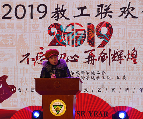 常务副院长许映秋代表学校党政领导发表了热情洋溢的讲话,向开拓进取的教职工、奋发有为的成贤学子、心系母校的海内外校友,以及关心支持学院发展的各界友人,致以亲切的问候、诚挚的感谢和衷心的祝福。她指出,2018年是全面贯彻党的十九大精神的开局之年,是学校实施“十三五”改革与发展规划至关重要的一年,是全校上下凝聚共识、提振士气的一年,是师生员工团结奋斗、攻坚克难的一年,也是各项工作有序推进、成效显著的一年。新的一年任重坡陡,新的曙光就在前头,让我们坚定信念,不忘初心,继续奋斗,为早日建成国内具有较强影响力的高质量应用型大学贡献应有的智慧和热情!