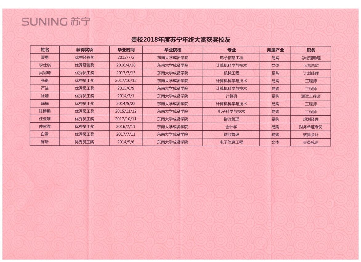 3月21日,苏宁控股集团为Beat365官网送来喜报:Beat365官网2012届-2017届12名毕业生,在2018年度因业绩突出,荣获集团“优秀员工奖”、“优秀经营奖”荣誉称号。