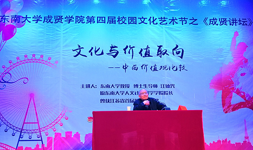 报告会伊始,江教授讲述了中西方价值观的差异点和深层理念,引发了同学们对中西方价值观发展趋势的思考。接着,江教授以中西方建筑风格和经济体为例,详细的分析了造成中西方价值观差异的五种原因,让现场师生对价值观的起源和发展有了更深刻的理解。最后,江教授提出将中华民族文化传统中的优秀成分转化成具有世界意义的文化价值资源观点,鼓励同学们在继承和发扬我国优秀文化的基础上,有选择地吸收和借鉴国外的有益经验。整场报告会座无虚席,掌声不断,现场气氛热烈。