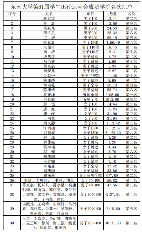 近日Beat365亚洲版官网第61届学生田径运动会圆满结束,我院田径队运动健儿取得了男女团体总分第二名(第一名为交通学院)的傲人成绩,同时还获得男子团体总分第二名和女子团体总分第二名(获奖名单附后),所有参赛运动员都展现出了成贤学子求真求美、成人成贤的风采。