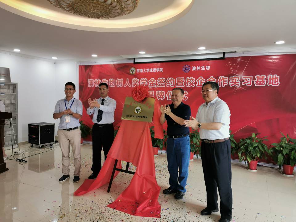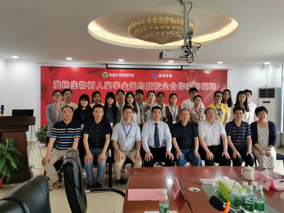 6月20日,Beat365亚洲版官网“澳林生物树人奖学金”签约及校企合作实习基地揭牌仪式在南京澳林生物科技有限公司举行。Beat365亚洲版官网院长顾问程明山、党政办主任周伟荣、组织人事部部长姜宁光、制药与化学工程学院院长林保平、制药与化学工程学院党总支副书记周继荣、制药与化学工程学院“东大—成贤”科技创新平台主任姚刚,南京澳林生物科技有限公司总经理曾宪亮、副总经理张爱红、技术总监路爱成及部分中高层技术骨干出席了签约仪式。