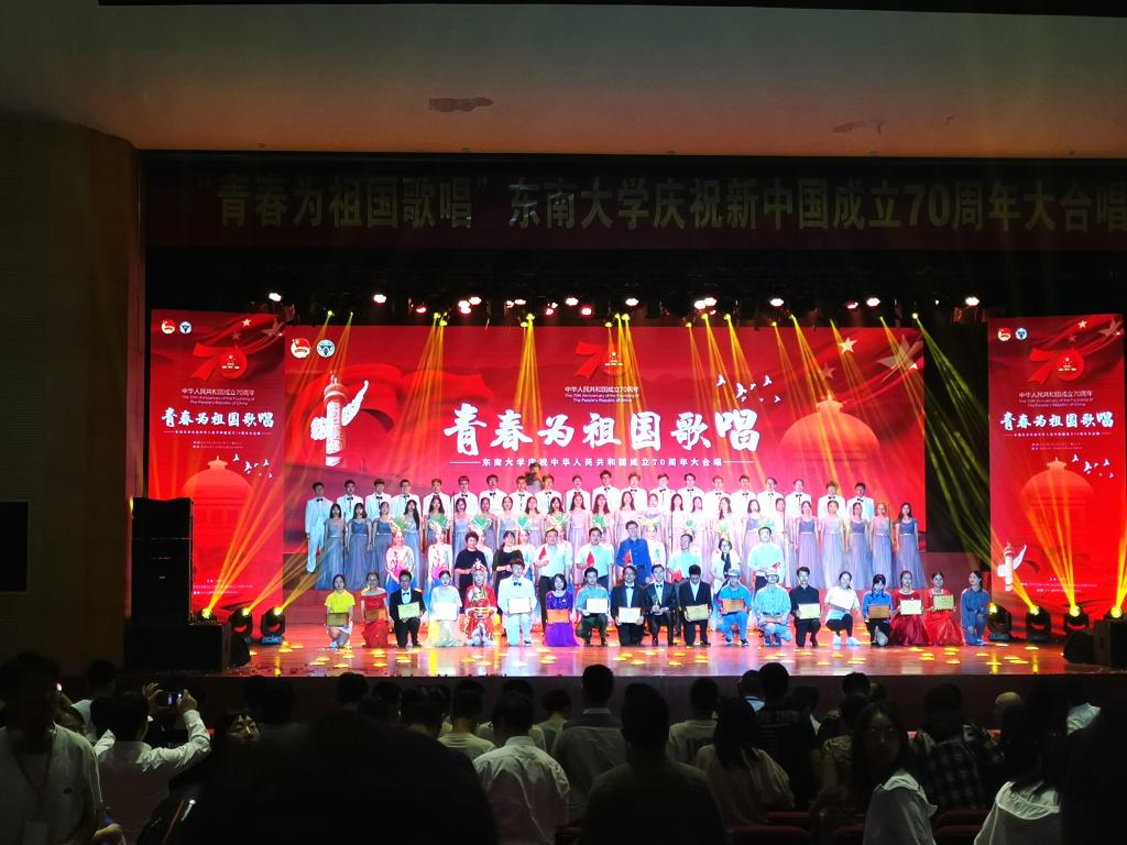 9月25日晚,为隆重庆祝新中国成立70周年,Beat365亚洲版官网大学生合唱团在Beat365亚洲版官网九龙湖校区焦廷标馆参加“青春为祖国歌唱——Beat365亚洲版官网庆祝中华人民共和国成立70周年大合唱”比赛,学院常务副院长许映秋,党委副书记、副院长、纪委书记王荣与我院大学生合唱团76名同学参加演出,比赛由团委书记潘明烽带队,学生处处长助理颜秉明指挥。