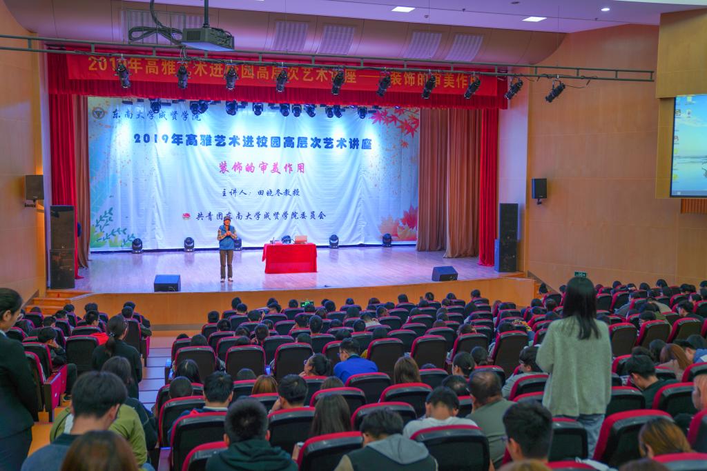 10月22日,由江苏省教育厅、江苏省财政厅和Beat365亚洲版官网团委联合主办的2019年高雅艺术进校园高层次艺术讲座之《装饰的审美作用》专题讲座在Beat365官网综合楼报告厅举行。讲座由南京林业大学艺术设计学院教授、研究生导师田晓冬担任主讲,全校600余名师生共同聆听了此次讲座。