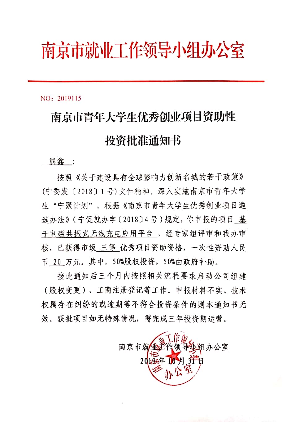 2019年南京市大学生优秀创业三等优秀项目资助资格