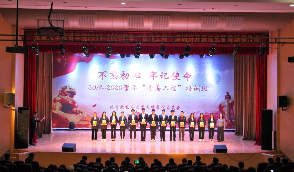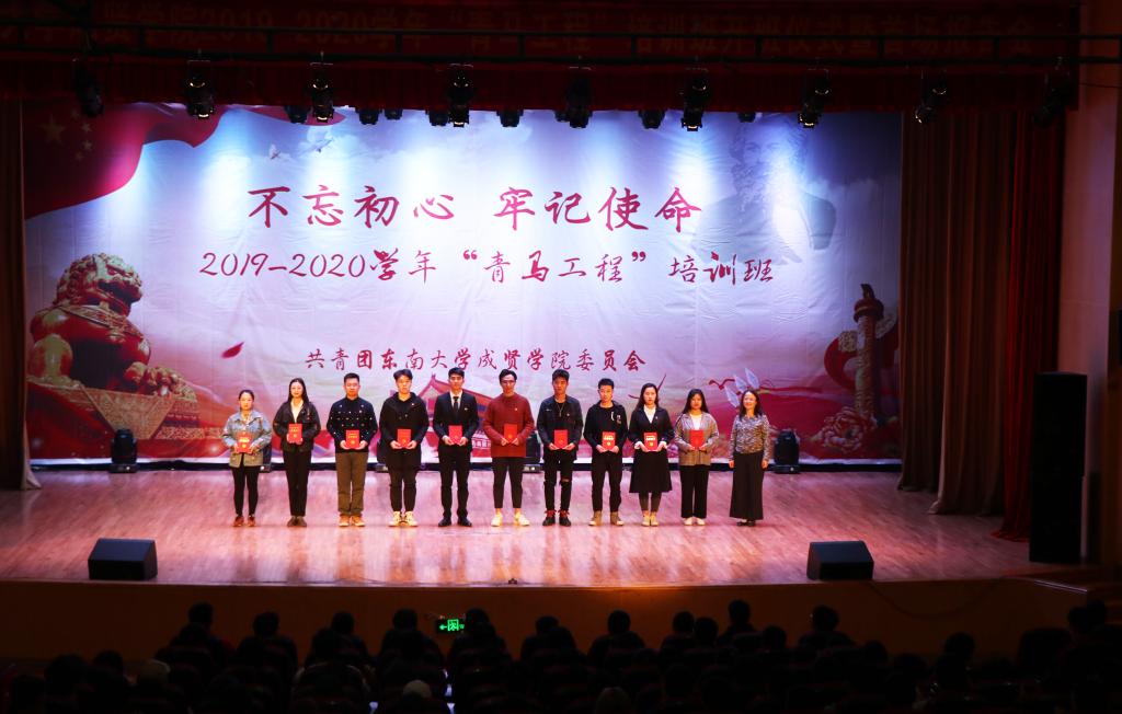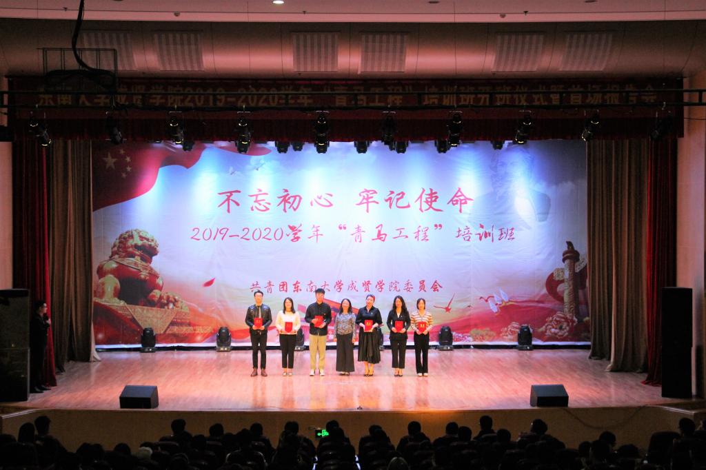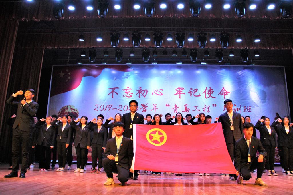 仪式在激扬嘹亮的共青团团歌中正式拉开帷幕。随后,大会通过视频回顾了上一年度“青马工程”培训班的学习情况,高晓红教授为2018—2019学年“优秀青马学员”颁发了荣誉证书。紧接着,高教授为本期青马班授旗并颁发了新秀班班主任聘书和《青年马克思主义者培养工程读本》图书,希望各院分团委、团支部都能不断加强自身建设,提高工作水平,鼓励学生们通过理论学习、实践锻炼、模范引领,努力成为马克思主义的薪火传播者。授书环节后,校团委学生副书记刘昊带领所有青马学员庄严宣誓。