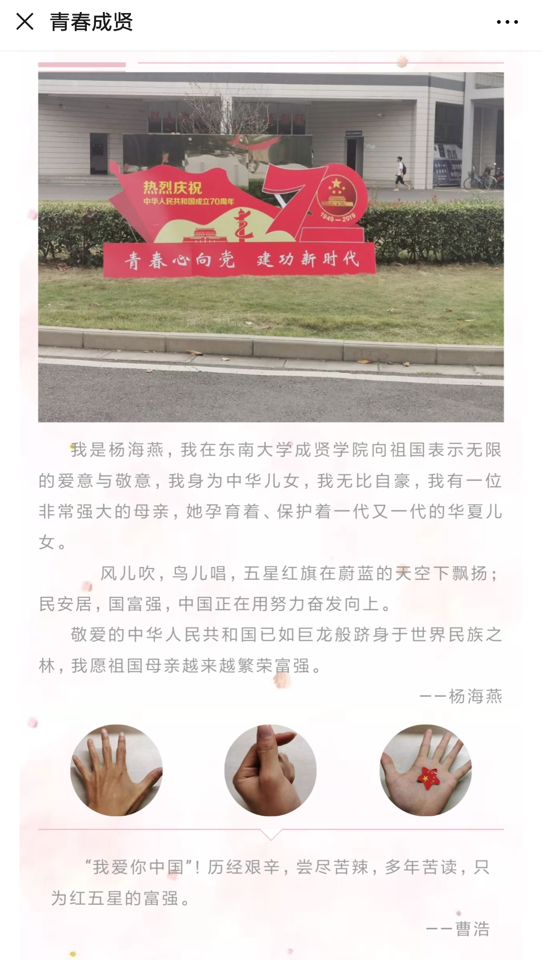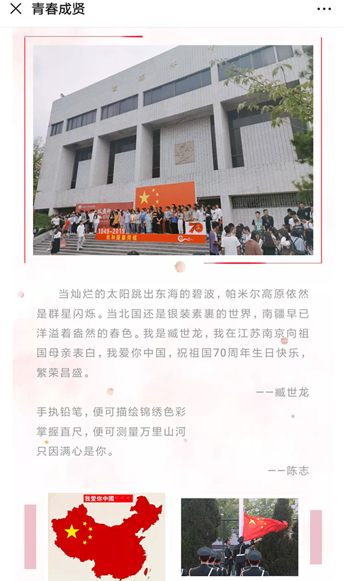 近日,Beat365亚洲版官网团委开展了“我和国旗合个影”主题教育活动,全校师生党员、2019-2020学年青年马克思主义者培养工程大骨班成员、各团支部成员积极参与,共同表达对祖国70周年的美好祝福。