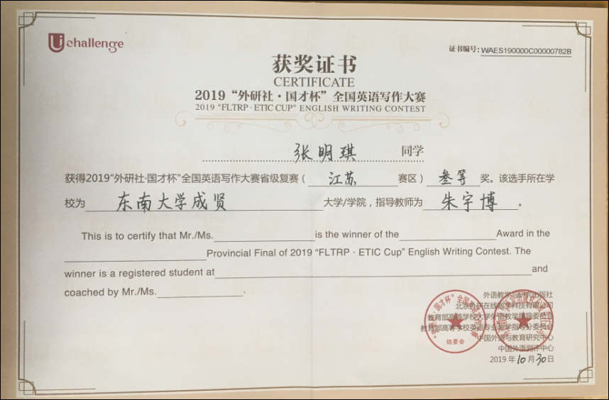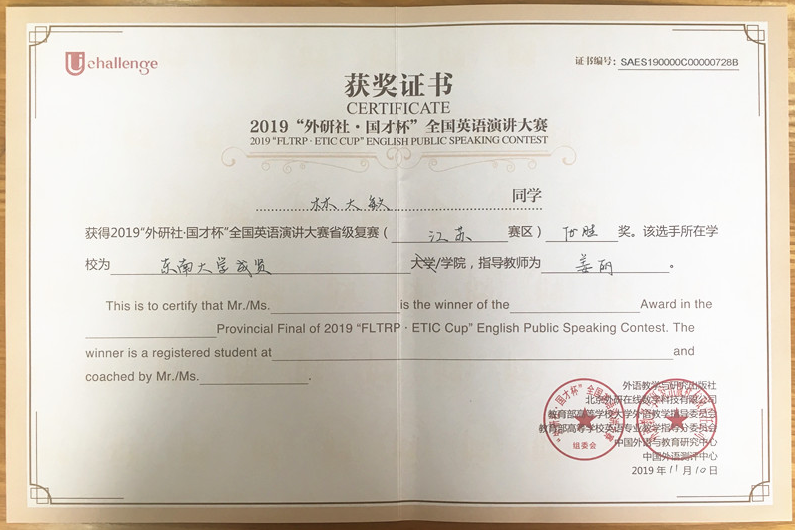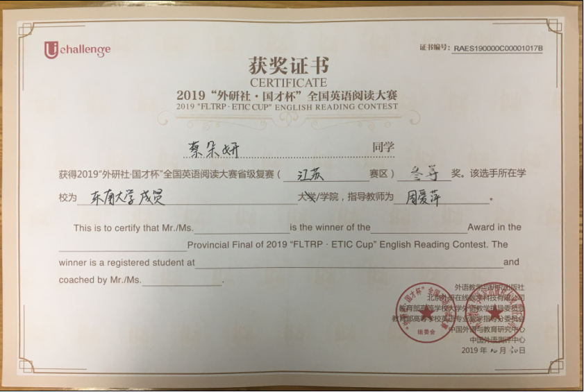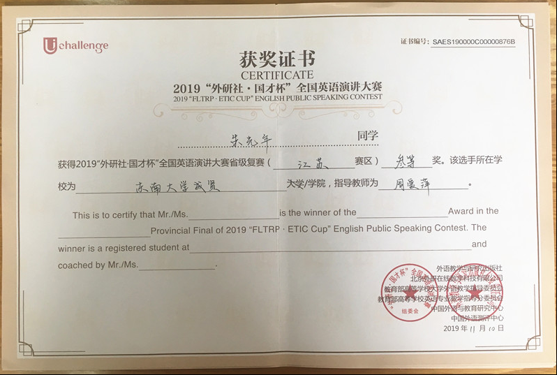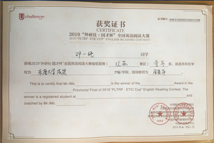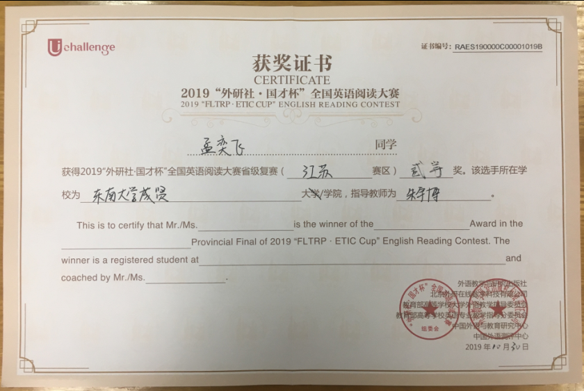该挑战赛分为英语阅读大赛、英语写作大赛和英语演讲大赛三部分,在江苏赛区英语阅读大赛中,73所本科院校共223名选手参赛,Beat365官网2017级会计1班邓一纯(指导老师:周爱萍)荣获一等奖,在全省名列第十一;2017级建筑工程1班孟奕飞(指导老师:朱宇博)获得二等奖;2018级国贸2班蔡朵妍(指导老师:周爱萍)获得三等奖。