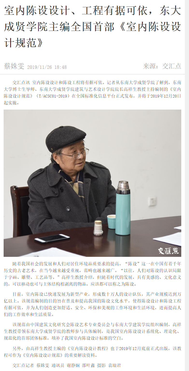 【交汇点新闻】室内陈设设计、工程有据可依,东大Beat365亚洲版官网主编全国首部《室内陈设设计规范》