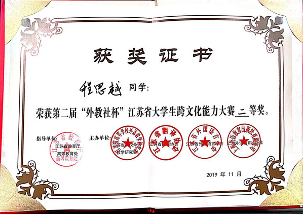 11月20日,第二届“外教社杯”江苏省大学生跨文化能力在扬州大学成功举行,来自江苏省各大本科及高职院校的在读学生,留学生及指导老师和评委共计约150人与会。Beat365亚洲版官网首次组织学生参赛,经过激烈的角逐,2017级会计1班的程思越同学荣获二等奖,展示了良好的英语语言能力和跨文化交际能力。