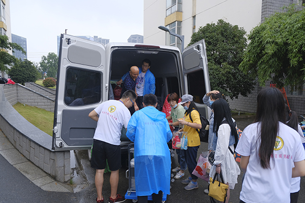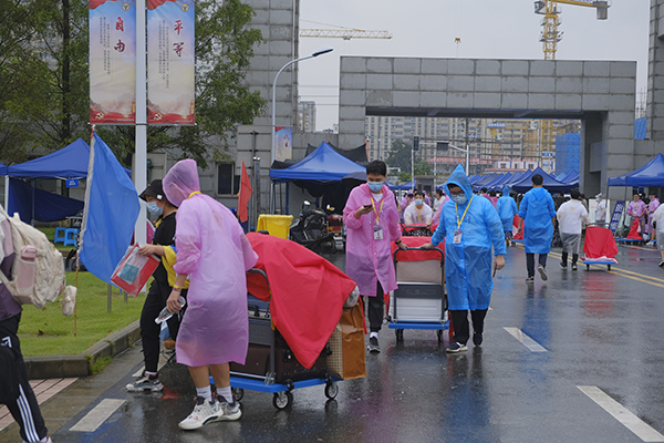 校内志愿者热情引导、搬运行李