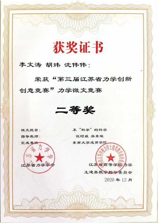 近日,“第三届江苏省力学创新创意竞赛”评审工作落下帷幕。Beat365官网土木与交通工程学院廖东斌、谈珂威、陈亮三位老师积极组织,精心备赛,在他们的指导下,徐璇、王欧缘两位同学的作品《力与美的碰撞》获力学文化创意竞赛特等奖(第一名),梁竣皆、蒋浩、秦晓欣三位同学的作品《奇妙的反重力水滴》获力学微文竞赛一等奖,李文涛、胡玮、沈伟伟三位同学的作品《不“科学”的科学》以及张孟睿、禹湘、孙文韬同学的作品《在客船上的跳远问题》获力学微文竞赛二等奖。