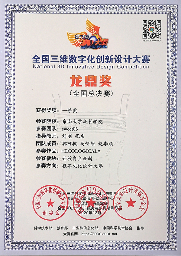 近日,第十三届全国三维数字化创新设计大赛总决赛落下帷幕。由刘刚、张庆等老师指导的“SWEET03”团队荣获2020年全国3D大赛之“数字文化设计大赛”全国总决赛一等奖,同时也是江苏省高校唯一获得该赛项一等奖的团队。