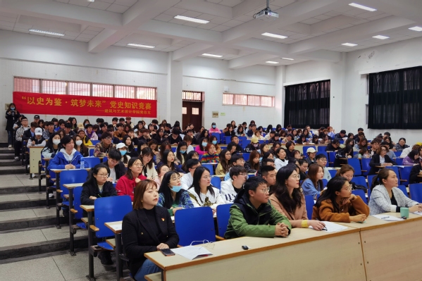 为庆祝中国共产党成立100周年,深入贯彻习近平新时代中国特色社会主义思想,落实习近平总书记在党史教育动员大会上的重要讲话精神,4月15日晚,建筑与艺术设计学院党总支在文昌院114教室举办“以史为鉴·筑梦未来”党史知识竞赛活动。学院全体学生党员、入党积极分子、学生会学生干部、20级学生和辅导员老师共300人参加了活动。