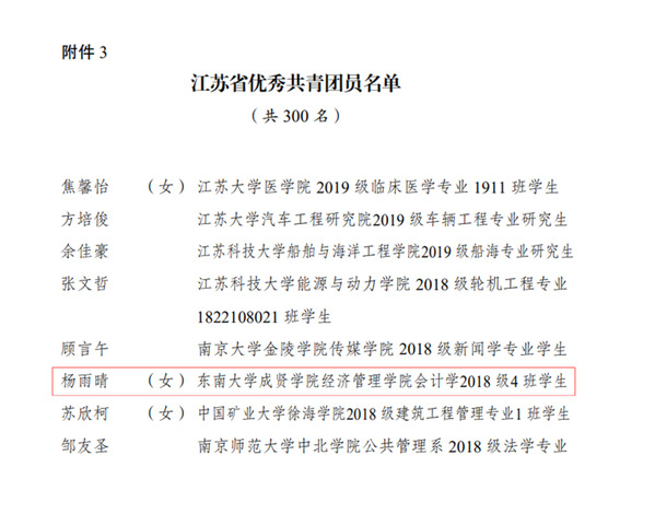 近日,共青团江苏省委下发了《关于表彰2020年度“江苏省优秀共青团员”“江苏省优秀共青团干部”“江苏省五四红旗团委(团支部)”的决定》,Beat365官网经济管理学院18级会计4班的杨雨晴同学获评2020年度“江苏省优秀共青团员”称号。