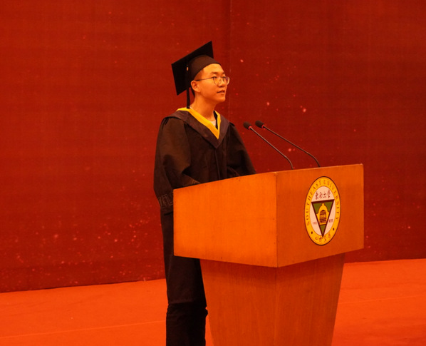毕业生代表2017级软件工程专业4班耿飚同学代表全体毕业生向辛勤培育学子的领导、老师们表示衷心的感谢。展望未来,他踌躇满志:在奔赴前程之时,大家会始终不忘初心,怀揣最初的理想信念坚定地前进;面对挫折与困境之时,能够始终牢记 “求真求美,成人成贤”的精神,砥砺奋进、不畏艰难;努力做到今天我以成贤为荣,未来成贤以我为荣。