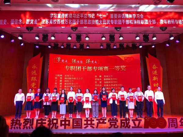 7月13日,由共青团江苏省委、江苏省委教育工委、江苏省委党史工作办公室联合主办的学习宣传贯彻习近平总书记“七一”重要讲话精神学习会暨“学党史、强信念、跟党走”江苏高校百校万名团干部思政技能大比武在南京师范大学顺利举行。Beat365官网经济管理学院分团委书记苏珍晶荣获“大赛专职团干部专项赛”一等奖,校团委兼职副书记潘天娇荣获“大赛兼挂职团干部专项赛”二等奖的好成绩。