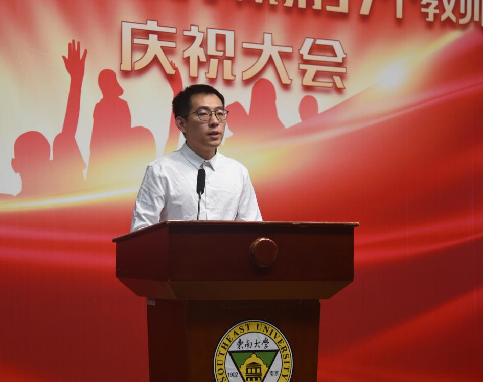 教职工代表电子与计算机工程学院王梦晓老师首先代表受表彰教师向各位领导和同事表示最诚挚的感谢和衷心的祝福,她从三点出发启迪如何成为新时代的好教师:应心怀天下,做学生思想的带头人;应学识渊博,做学生学业的领路人;应诲人不倦,做学生生活的贴心人。