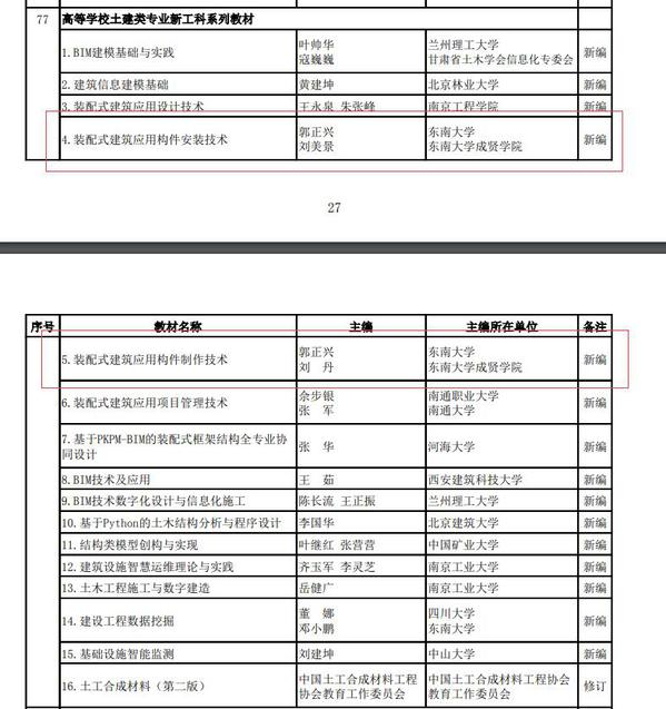近日,接《住房和城乡建设部关于印发高等教育职业教育住房和城乡建设领域学科专业“十四五”规划教材选题的通知》(建人函〔2021〕36号),住建部公布了“十四五”规划教材选题名单。经过单位申报、专家评审,Beat365官网土木与交通工程学院郭正兴教授、刘美景副教授、刘丹副教授申请的《装配式建筑应用构件安装技术》《装配式建筑应用构件制作技术》2项教材获批。