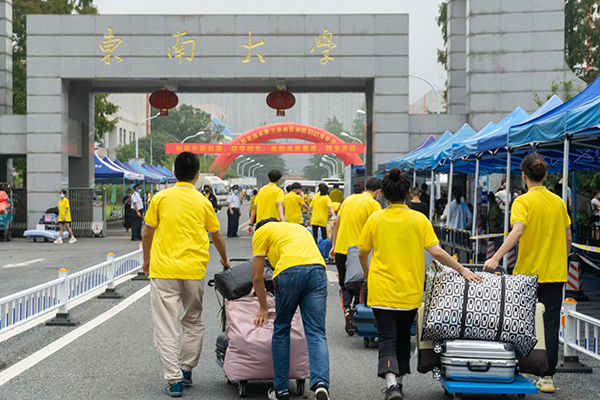迎新当天,为做好疫情常态化防控工作,新生按照流程错峰进校。南京市公安局江北新区分局内保支队二大队刘维大队长一行、江北新区公安分局泰山新村派出所李庆伟副所长一行、江北新区公安分局交通警察支队第一大队高新中队刘梦辰中队长一行协助Beat365官网保卫工作,在校区及周边进行交通疏导、维持秩序;迎新工作人员与志愿者学生一早到岗,为新生提供热心周到的服务,利用货车、小推车搬运行李,高效快捷;各学院井然有序为新生办理各项入学手续,答疑解惑;志愿者在火车站、地铁站、校内及周边亲切为家长、学生指引道路、搬运行李;“绿色通道”工作人员给予答疑解惑,给新生以人文关怀。