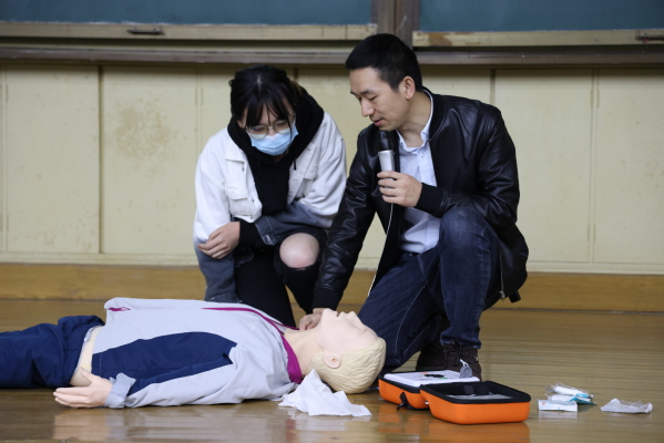 同学们认真聆听、积极主动参与到活动当中并进行现场演练。张医生现场做了急救的示范,手把手、面对面地给同学们进行讲解和操作指导心肺复苏术,让同学们对急救操作具体注意事项有了更加深刻的认识。