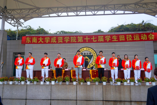 王荣副书记宣读《关于表彰2020-2021学年十佳运动员和体育先进工作者的决定》和第十六届学生田径运动会表演方阵获奖单位,并由参会嘉宾和校领导为代表颁奖,运动员代表莫庸同学、裁判员代表丁亮老师分别代表运动会运动员和裁判员郑重宣誓。蒋波书记宣布本届运动会开幕。