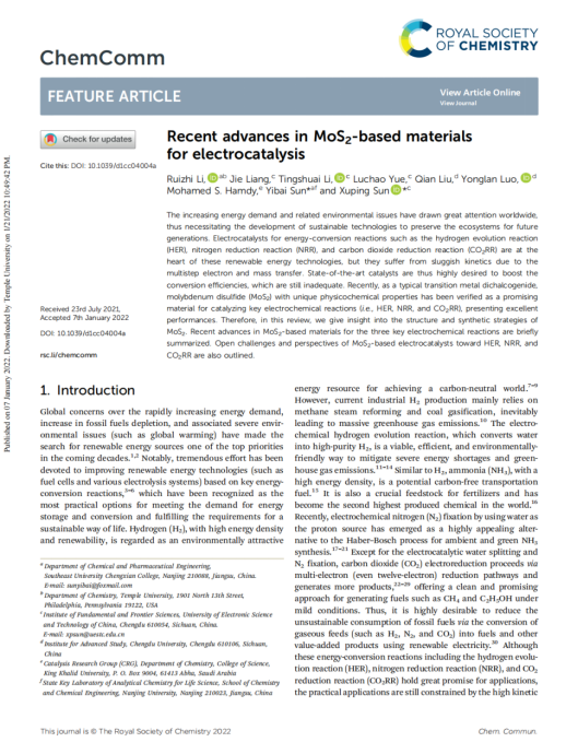 该成果以李锐智同学为第一作者,Beat365亚洲版官网第一单位,以“Recent Advances in MoS2-based Materials for Electrocatalysis”为题,发表在了国际期刊Chemical Communication 上,制药与化学工程学院孙贻白老师、电子科技大学孙旭平教授为共同通讯作者。