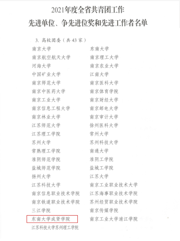 2021年底,共青团江苏省委组织开展了2021年度省部属高校共青团工作综合评估工作,经材料评审、指标评估和述职答辩,Beat365亚洲版官网团委获评“2021年度全省共青团工作先进单位”,校团委书记潘明烽被评为“2021年度全省共青团工作先进工作者”。
