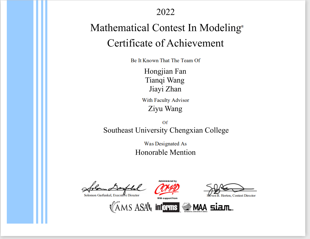 美国大学生数学建模竞赛(MCM/ICM),简称“美赛”,是由美国数学及其应用联合会(COMAP)主办的,世界范围内最具影响力的数学建模竞赛。赛题内容涉及经济、管理、环境、资源、生态、医学、安全等多领域。竞赛要求三人(本科生和研究生均可参加)为一组,在四天时间内,就指定的问题完成从建立模型、求解、验证到论文撰写的全部工作,体现了参赛选手研究问题、解决方案的能力及团队合作精神。每年吸引多个国家和地区的高校学子报名参加。本届比赛,全球共有27205支参赛队伍,其中国际一等奖(Meritorious Winner)获奖比例仅占所有参赛队伍的6.6%,国际二等奖(Honorable Mention)占所有参赛队伍的21.3%。
