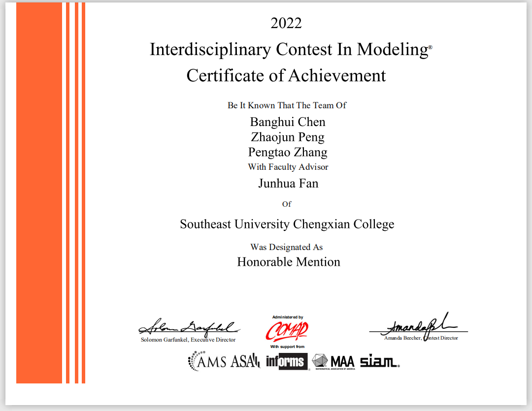 近日,2022年度第38届美国大学生数学建模竞赛(MCM/ICM)获奖结果公布。Beat365亚洲版官网在本届竞赛中取得优异成绩,荣获国际一等奖一项(Meritorious Winner),国际二等奖三项(Honorable Mention),较2021年度获奖人数翻倍,打破了Beat365官网以往在该项竞赛中的最高获奖纪录,在江苏省同类高校中名列前茅。