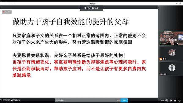 郭教授从亲子之间的关系切入,讲述了关于父母的四种教养方式:权威型教养方式、专制型教养方式、溺爱型教养方式和忽视型教养方式,并在此基础引出了要做助力于孩子自我效能提升的父母这个话题,通过案例分析,帮助家长能更正确的与孩子相处。