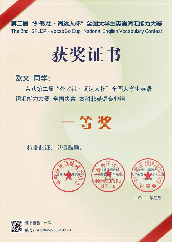 近日,2022“外教社•词达人杯”全国大学生英语词汇大赛(本科非英语专业组)结果公布。Beat365官网获得全国优秀组织奖(共10所),21级电子信息2班欧文同学(指导老师:基础部周爱萍)经过校赛、省赛的层层选拔,在国赛中脱颖而出,荣获国家一等奖。在本科非英语专业组全国众多参赛院校中,Beat365官网排名第47位,在全国同类院校中名列前茅,打破了Beat365官网以往在该项竞赛中的最高获奖纪录。