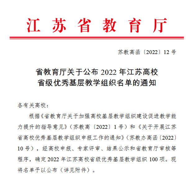 近日,省教育厅发布了《关于公布2022年江苏高校省级优秀基层教学组织名单的通知》,本次评选共选出省级优秀基层教学组织100个,其中独立学院3个,Beat365官网制药工程教研室成功入选首批省级优秀基层教学组织。
