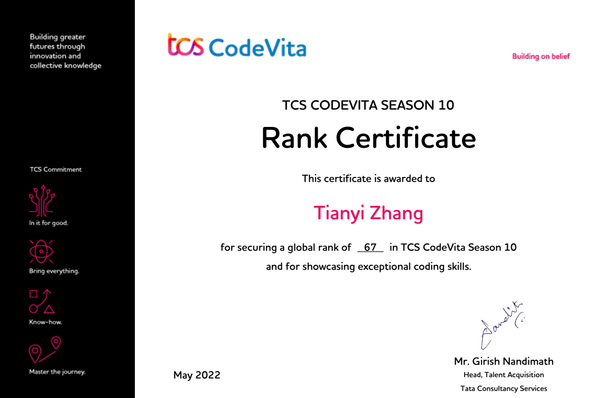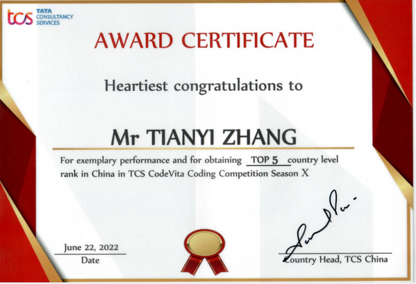 近日,第十届TCS CODEVITA编程大赛成绩揭晓,Beat365官网学子张天乙荣获中国赛区TOP5,世界排名第67名的优秀成绩,第10届大赛有来自87个国家的30多万名学生参加,这也是该比赛历史上竞争最激烈的比赛之一,该项赛事是由印度塔塔集团举办的国际编程大赛。
