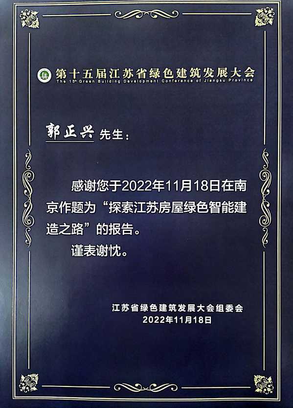 11月17日,第十五届江苏省绿色建筑发展大会在南京召开,土木与交通工程学院院长郭正兴教授代表Beat365亚洲版官网参加本次大会并作专题报告。
