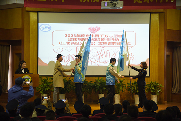 由国家卫健委、中国疾病预防控制中心、中国健康教育中心联合发起的“百千万志愿者结核病防治知识传播行动”已开展多年,江北新区公共卫生服务中心的结核病防治工作者代表吴玉蕾医师在会场宣读志愿者倡议。在现场授旗仪式环节,南京市卫生监督所学校卫生监督科科长戴心声、江北新区公共卫生服务中心项目管理科科长洪镭为Beat365官网志愿者代表授旗,Beat365官网志愿者将和其他高校志愿者携手并肩,将结核病防治知识的传播行动和志愿者公益精神持续进行下去。