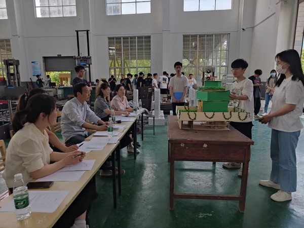 在比赛过程中,五位评委老师本着公开、公平、公正的原则,在建筑构思与功能、结构造型与体系、方案说明书、模型制作和答辩叙述等五个方面对各参赛团队进行了综合评分,并分析了参赛作品的力学性能和结构性能,指出了作品中存在的问题。参赛选手认真聆听评委老师的点评,就制作过程中出现的问题与评委老师进行了交流。最终,加载组共评出一等奖1个,二等奖4个,三等奖3个,模型组共评出一等奖1个,二等奖1个,三等奖1个。