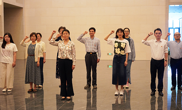 江北新区红色广场紧邻津浦铁路文化广场与浦口明城墙遗址,是首次以展览的形式系统反映江北地区在中国共产党历史、中国革命史和中国工人运动史中重要的地位与贡献。党员同志们依次参观了红色文化展陈馆7个展厅,通过图片、实物、场景、讲解的形式,现场感受王荷波、两浦铁路工人鲜活的革命形象传递出的伟大革命精神,众人追忆南京早期党组织的光辉历史,重温中国共产党波澜壮阔的斗争岁月。在江北地区革命志士群体雕像前,全体党员同志面对党旗重温入党誓词并庄严宣誓。