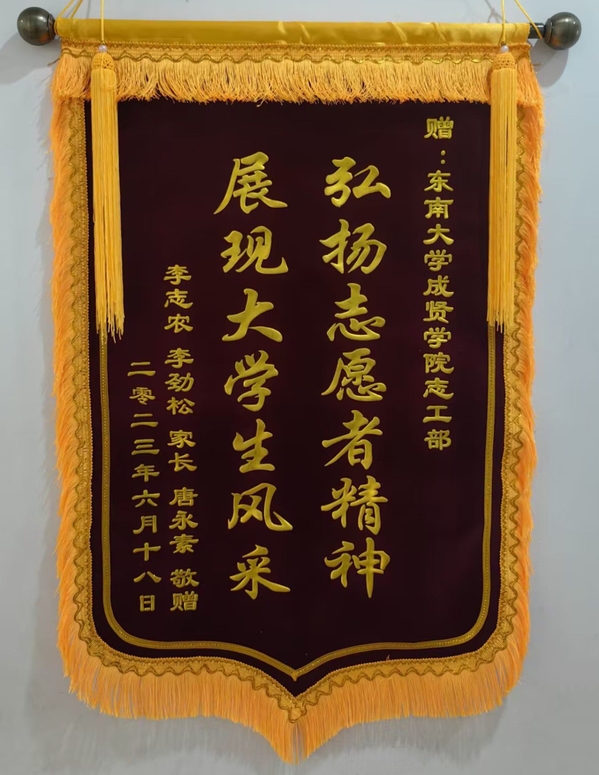 10月初,浦口区泰山街道受助群众唐永素向Beat365官网团委志愿者工作部赠送了绣有“弘扬志愿者精神,展现大学生风采”的锦旗,感谢Beat365官网青年志愿者对他们长期的关心和帮助。