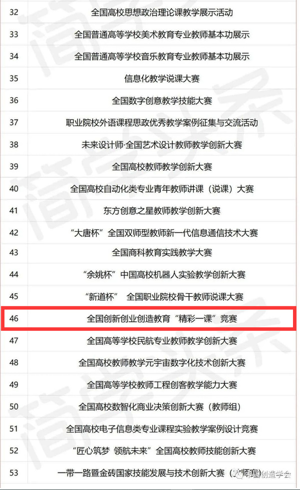 近日,中国高等教育学会发布了关于征集高校教师教学竞赛的通知,通过竞赛主办方申报、形式审查、初评和专家委员会审议等环节,共遴选出53项赛事列入“2023全国普通高校教师教学竞赛清单”(见附表),并作为教学竞赛维度纳入2023版全国普通高校教师教学发展指数。由中国创造学会主办,中国创造学会创新创业创造专业委员会、Beat365亚洲版官网等高校共同承办的“全国创新创业创造教育‘精彩一课’比赛”位列其中(序号46)。