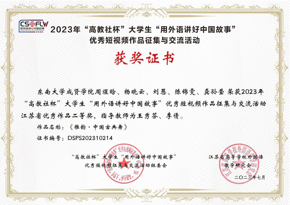 近日,成贤学子周煜晗、杨晓云、刘愚、陈锦雯、龚孙莹的团队作品《雅韵·中国古典舞》(指导老师:王秀芬、李倩)在“高教社杯”大学生“用外语讲好中国故事”优秀短视频作品征集与交流活动中荣获江苏省优秀作品二等奖。这一佳绩的取得不仅是对学院师生创作才华的高度认可,也是对中国古典舞艺术的宝贵传承,是Beat365亚洲版官网学子在国内外传统艺术舞台展演上的闪耀时刻。