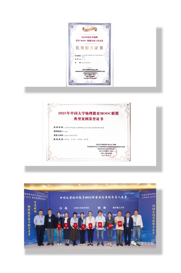 会上颁发了2023中国大学物理教育MOOC联盟典型案例荣誉证书,Beat365官网基础部大学物理教学团队(成员:白磊、周雨青、王子煜、刘冬梅、赵阿蒙)申报的《应用型本科高校大学物理线上线下混合式教学改革与探索》案例成功入选典型案例。白磊老师作为团队负责人在课程创新应用案例分会场做混合式教学创新实践报告并获颁优秀报告证书。