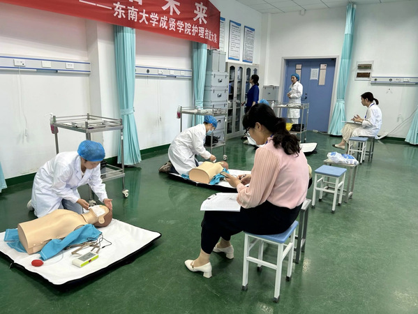 本次比赛内容包括基础技能——无菌技术和心肺复苏两项操作。评委们对每位选手的表现认真点评,从操作前准备、核心步骤、操作原则及终末处置等各环节作出公平公正的评判。在比赛过程中,同学们目光专注,精神饱满,动作有力有序,现场的氛围紧张严肃。