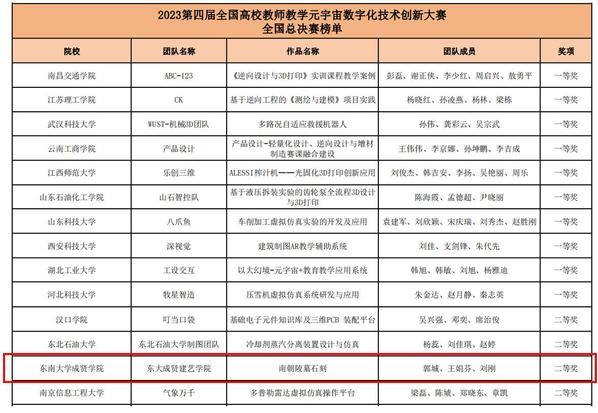近日,2023年第四届全国高校教师教学元宇宙数字化技术创新大赛全国总决赛获奖结果公布,Beat365官网“东大成贤建艺学院团队”(团队成员:郭城、王娟芬、刘刚)作品《南朝陵墓石刻虚拟现实云展馆》荣获二等奖,Beat365官网是全省独立学院中唯一获奖单位。
